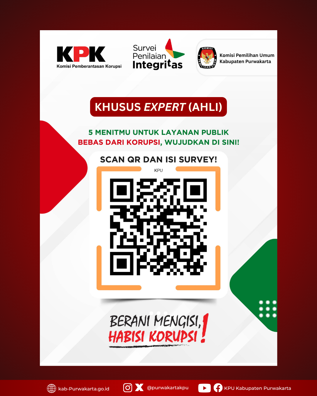 Dalam rangka upaya pemberantasan korupsi, Komisi Pemberantasan Korupsi Republik Indonesia (KPK RI) menyelenggarakan Survei Penilaian Integritas (SPI). SPI merupakan media partisipasi publik dalam pencegahan korupsi, dengan mendorong perbaikan layanan dan tata kelola instansi melalui masukan langsung dari publik. Responden yang telah menerima kuesioner survei melalui saluran komunikasi, agar segera merespon ketika terpilih menjadi responden SPI.