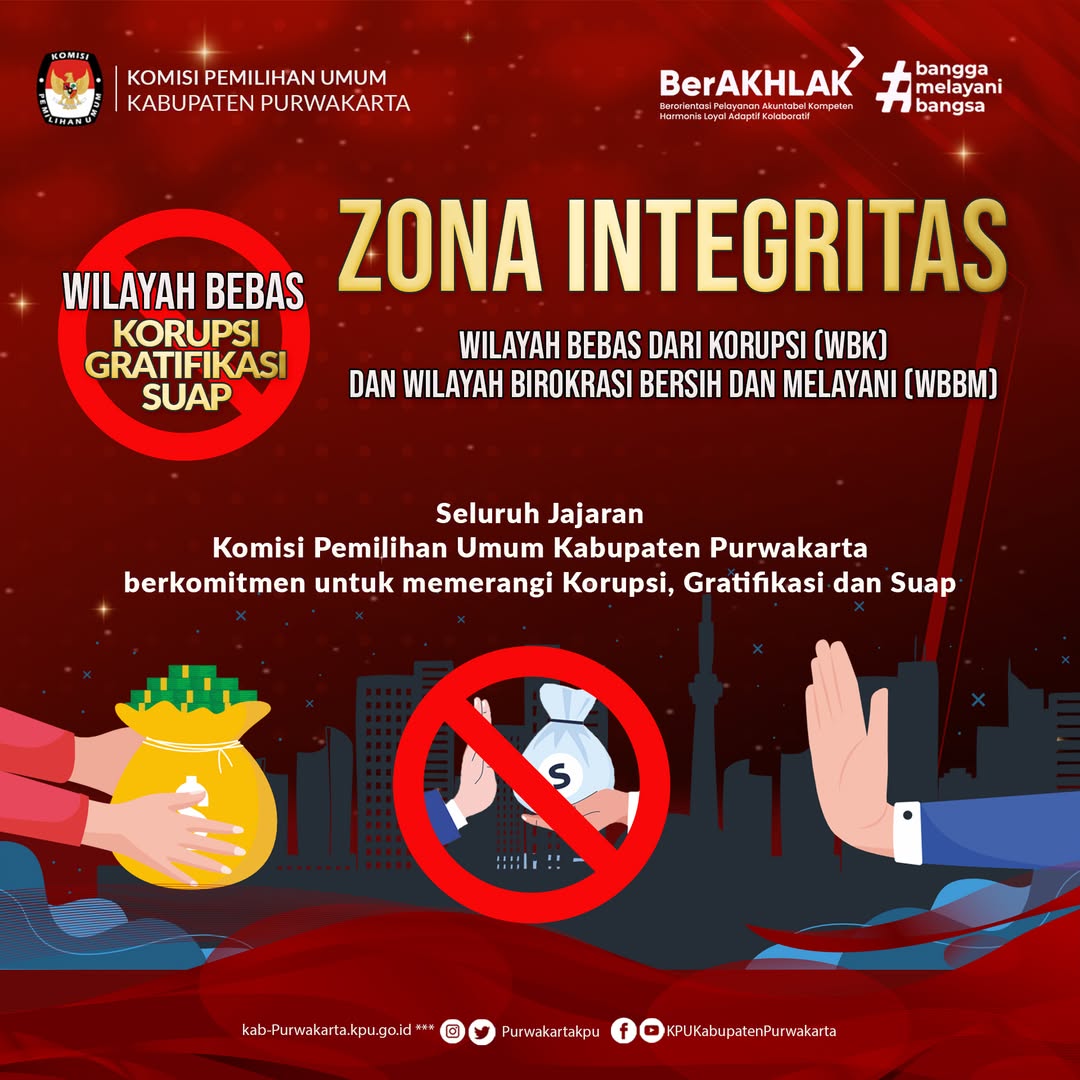 KPU Kabupaten Purwakarta berkomitmen untuk mewujudkan Zona Integritas menuju WBK/WBBM sebagai bagian dari penguatan tata kelola lembaga yang bersih, profesional, dan melayani publik secara optimal.